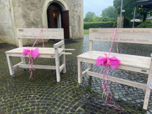 Die Bänke sind dank Rollen an einer Seite mobil und können so an unterschiedlichen Standorten aufgestellt werden. „Wir wünschen uns, dass sie in allen Stadtteilen und Ortsteilen aufgestellt werden“, so Elisabeth Sandmann. Den Namen Baumelbank verdient das Möbel, weil die Sitzposition so hoch ist, dass die Beine baumeln können. Was man noch alles mit der Bank anstellen kann, außer sitzen und Beine und Seele baumeln lassen, zeigten Schülerinnen des Städtischen Gymnasiums. Diese hatten sich eigens für die Bank leichte Fitnessübungen ausgedacht, die von jedem ausgeführt werden können. Alle Bänke werden in Kürze einen QR-Code erhalten, wo die Übungen erläutert werden.