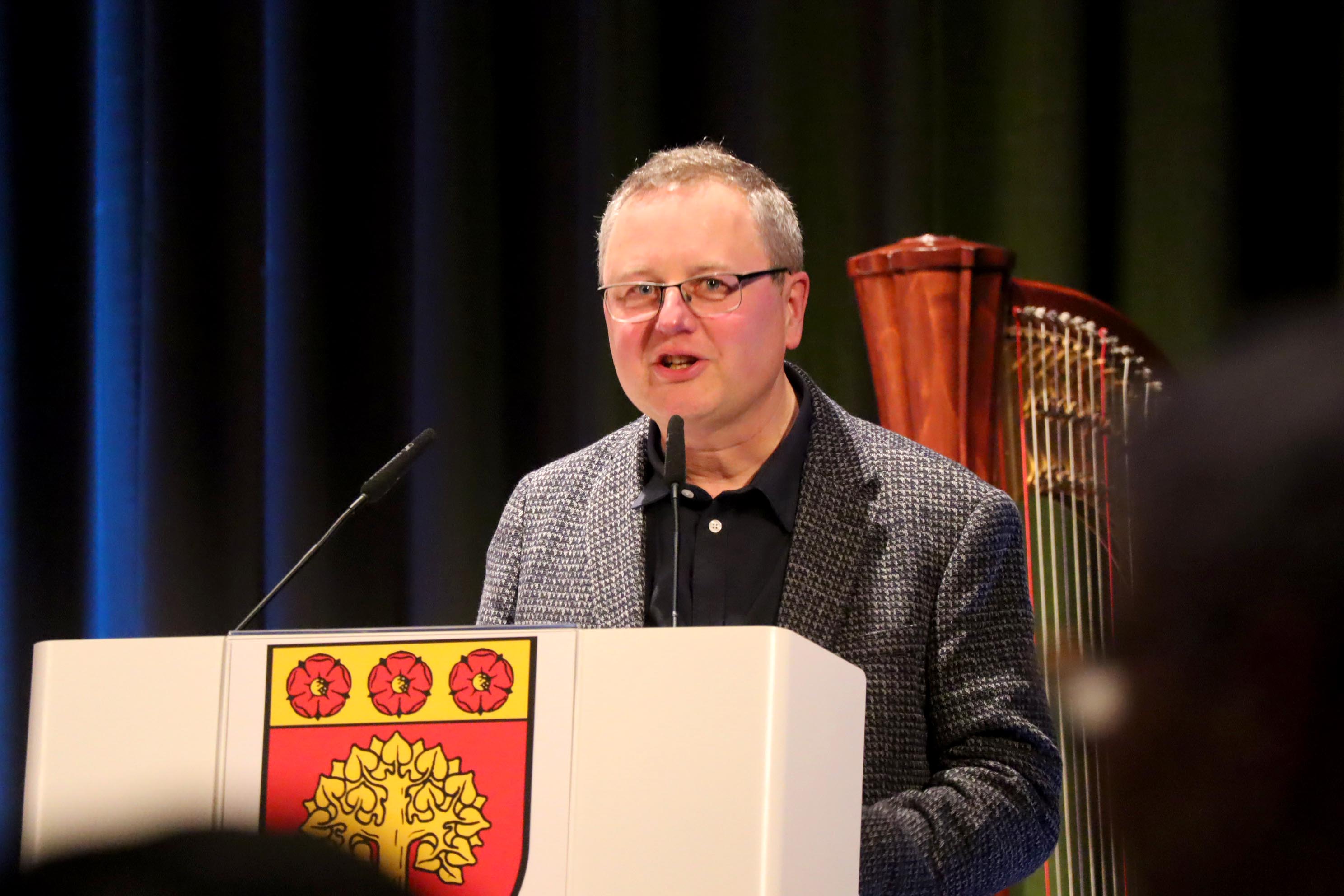 Bürgermeister Heinz-Georg Mors hob in seiner Begrüßung die Bedeutung der Kultur und der Wirtschaft für die Stadt Selm hervor. „Beides sind sehr wichtige Bereiche, ohne die das Zusammenleben in der Stadt nicht funktioniert“, so Mors. Daher habe der Preis, der die Verbindung zwischen diesen beiden Welten schaffe, eine große Relevanz. Jo Hölzer, der Vorsitzende des WiKult, erklärte, dass die Jury sich einstimmig für Guido Pyka als diesjährigen Preisträger ausgesprochen habe. Er folgt damit auf Johannes Wüllhorst, der 2023 den Preis gewonnen hatte.