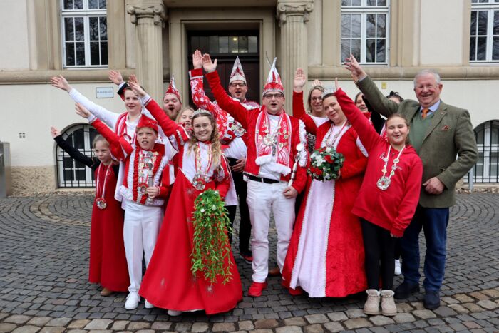 Närrische Grüße überbrachten die Selmer Karnevalsprinzenpaare am Dienstagmorgen der Stadtverwaltung. Das große Prinzenpaar Prinz Sascha Holz und Prinzessin Denise Skrsipek sowie das Kinderprinzenpaar Prinz Ben Bähre und Prinzessin Anni Groppe machten bei ihrer traditionellen Tour als ersten Halt im Amtshaus Station. Dort wurden sie herzlich von Bürgermeister Heinz-Georg Mors empfangen.